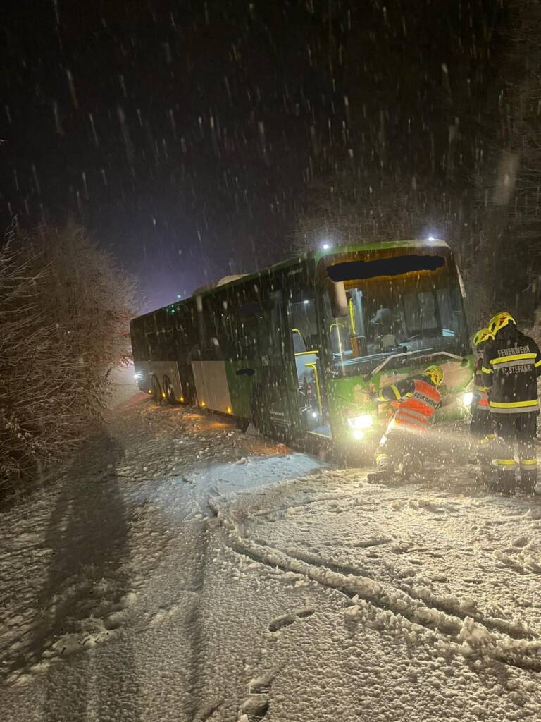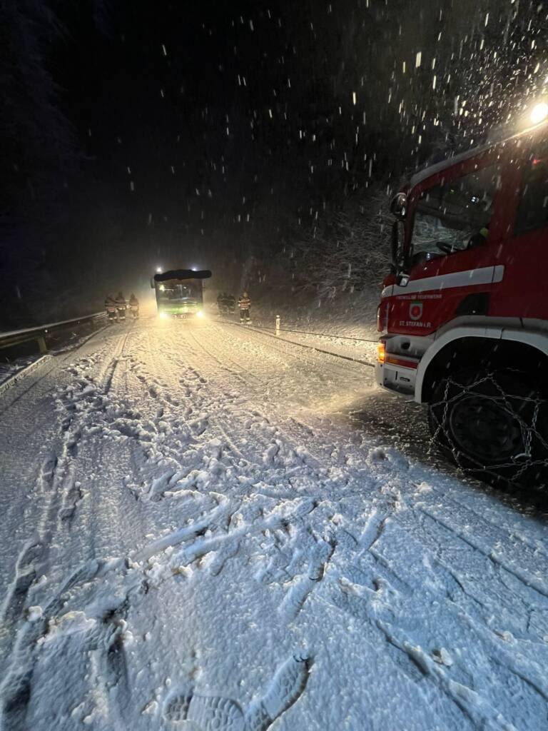 Um 00:21 Uhr wurden wir per Sirenenalarm zu einem Busunfall am Sonnenberg alarmiert. Ein Bus, von Kirchbach kommend, geriet aufgrund der winterlichen Fahrbahnverhältnisse ins Rutschen, blieb seitlich hängen und drohte weiter abzurutschen. Gemeinsam mit der FF Ziprein wurde das Fahrzeug mit zwei Seilwinden gesichert und anschließend kontrolliert geborgen. Nach rund 1,5 Stunden konnten wir wieder einsatzbereit einrücken.