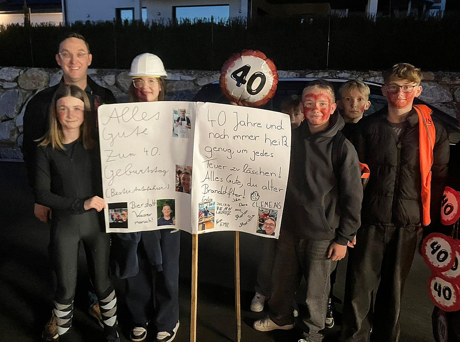 Das Kommando, Mitglieder des Feuerwehrausschusses und der FW-Jugend gratulierten dem Beauftragten für die FW-Jugend zu seinem besonderen Geburtstagsjubiläum. Ein bisschen Halloween musste auch sein.