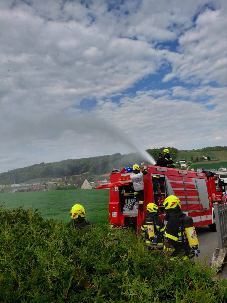 Mittels Gefahrenguthelfer konnte die Gefahr erkannt werden, und es wurde sofort ein Brandschutz über den angrenzenten Hydranten aufgebaut. Parallel dazu wurde eine Druckbelüftung eingerichtet, um die Situation weiter zu entschärfen.