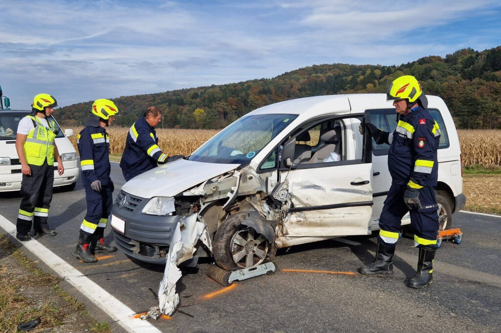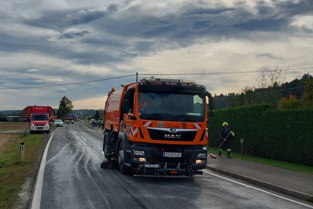 Unsere Einsatzmaßnahmen begannen mit dem Absichern der Unfallstelle, der Sperrung der gesamten Landesstraße durch die Polizei, Aufbau eines Sichtschutzes für ungestörte Versorgung der verletzten Person und Unterstützung des Rettungsdienstes sowie die Betreuung der Lenkerin – sie wurde vom RTW mitgenommen. Im Anschluss wurden die Fahrzeuge vom Gefahrenbereich gebracht, sicher abgestellt und die ausgetretenen Betriebsmittel gebunden.