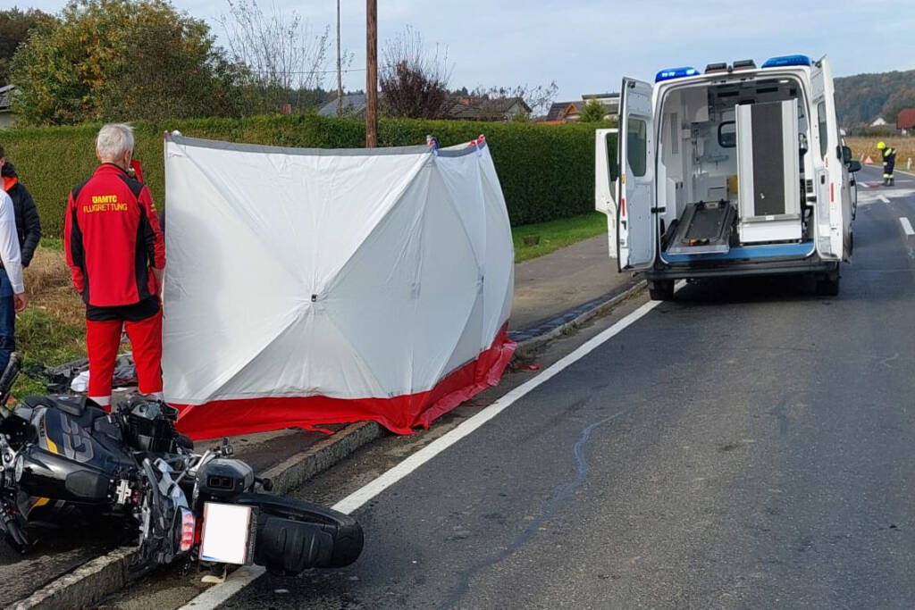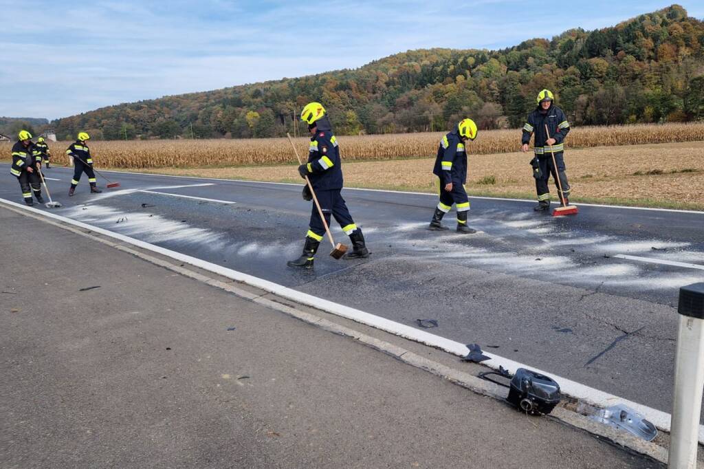 „SIRENENALARM um 14:11 Uhr – T03-VU-Berg.-Öl-Maiersdorf – Binden von Betriebsmittel nach VU Motorrad“ lautete die Alarmmeldung.