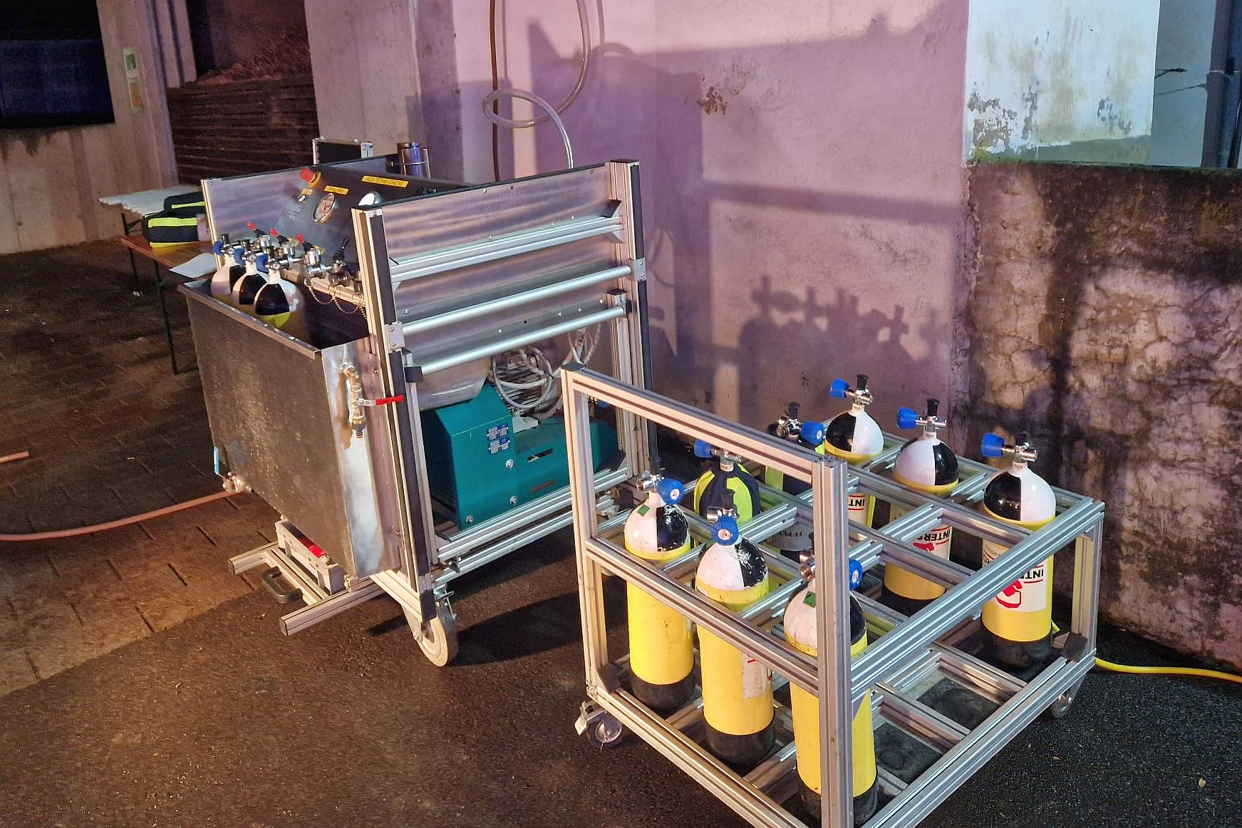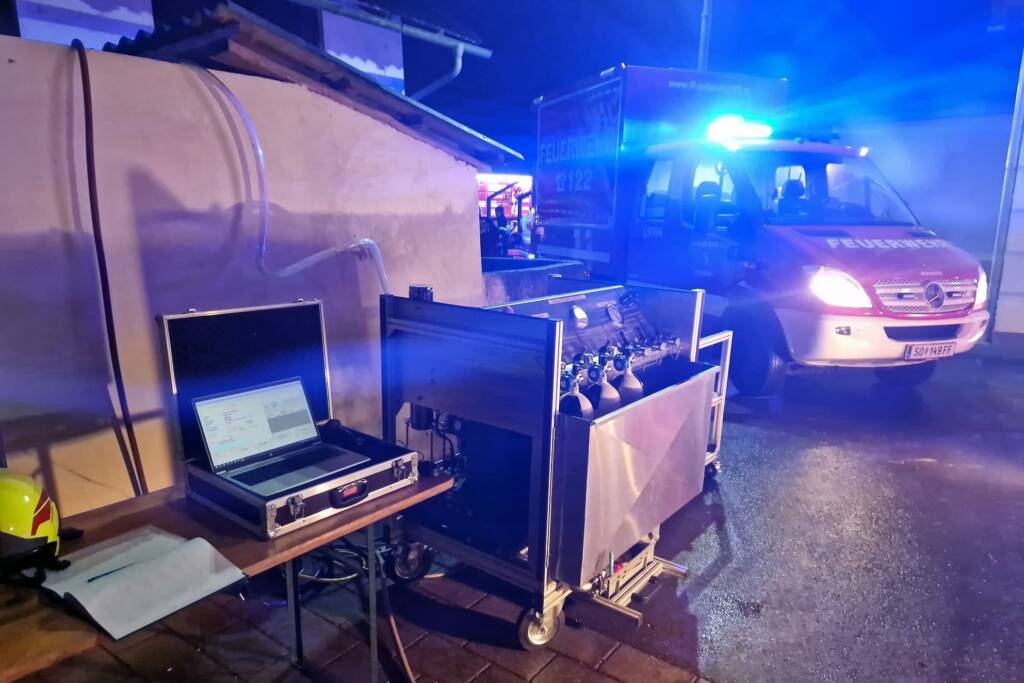 Drei Kameraden fuhren mit dem LKW und dem Atemluftkompressor zum Einsatzort. Vorort konnten 36 Pressluftflaschen gefüllt werden. Um 06:00 Uhr konnten sie wieder ins FW-Haus einrücken.